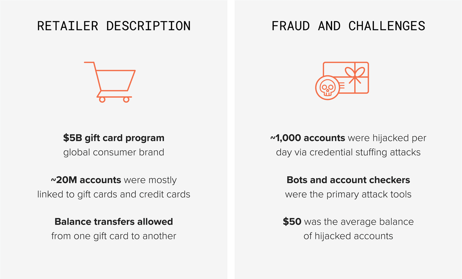 A Fortune 500 retailer manages a gift card program with a stored value of over $5B. Cybercriminals targeted the program, stealing tens of millions of dollars from the company and its customers. Attackers used credentials spilled from other website breaches to hijack customer accounts and steal funds from gift cards. Fraudulent login attempts exceeded a million per day and made up over 90% of the traffic to the login URL. Traditional defenses, like web application firewalls, intrusion detection and prevention services, and fraud analytics, failed to prevent these ongoing automated attacks. The Fortune 500 retailer deployed the F5 Distributed Cloud Bot Defense and completely eliminated account hijackings.