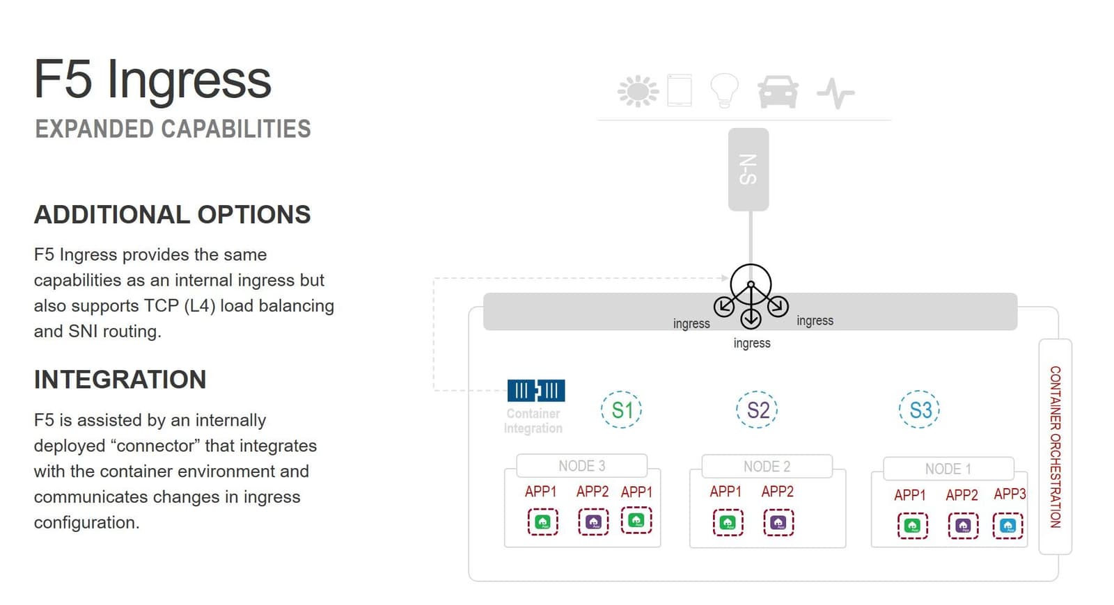 F5 provides the same capabilities as a classical Kubernetes ingress but adds additional capabilities in the form of SNI routing and layer 4 (TCP) load balancing. The ability to perform SNI (server name indicator) routing is a benefit for those desiring end-to-end TLS encryption of message exchanges, as it enables F5 to properly route requests based on information in the headers without decrypting the actual payload/message. While this restricts the range of functionality that can be applied to the request – for example, it cannot be scanned for malicious content – it provides the necessary support for architectures in which content must remain encrypted for regulatory or operational reasons. Layer 4 (TCP) load balancing is often used external to a container environment to scale Kubernetes style ingress services.