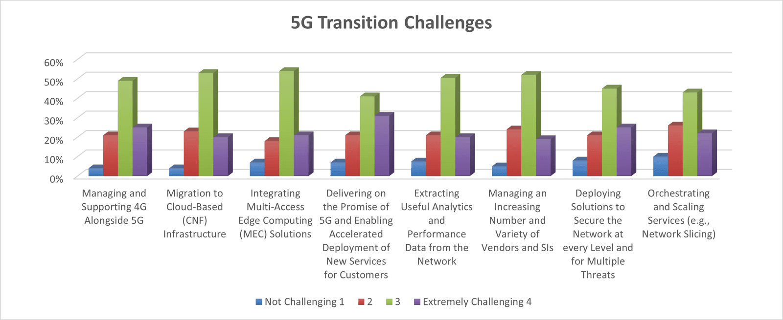Transitioning to 5G is critical, but it presents some difficulties. According to the same IDG report, 31% of service providers state that delivering on the promise of 5G and enabling accelerated deployment of new services for customers are both extremely challenging. The next big concerns seen are managing and supporting 4G alongside 5G, migrating to a cloud-based (CNF) infrastructure, and integrating multi-access edge computing (MEC) solutions.
