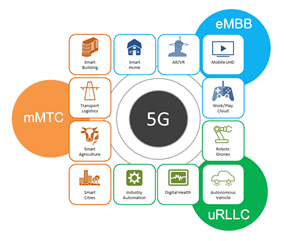 Figure 1: Characteristics of a 5G network segmented into 3 major use cases: massive Machine-Type Communication (mMTC), enhanced Mobile Broadband (eMBB), and ultra-reliable Low-Latency Communication (uRLLC)