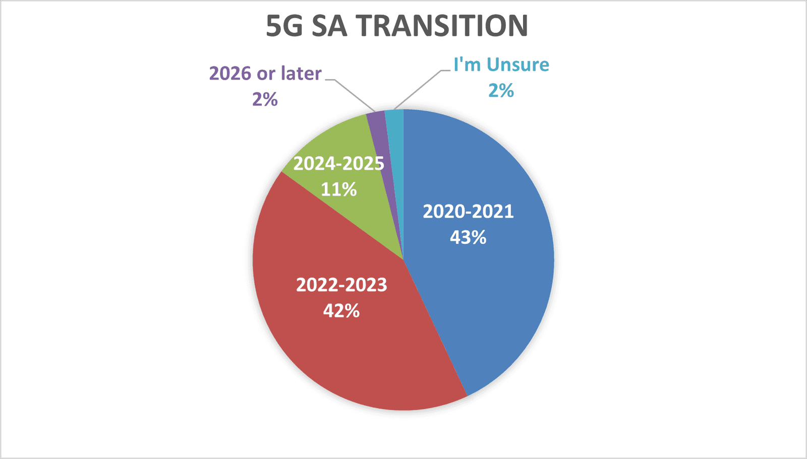 Based on a recent IDG analyst report, 5G and Telecommunications in 2020, F5 determined that 85% of service providers queried ­­­are planning to complete their 5G SA transition by 2022­–23—which means that the race to achieve a full 5G SA architecture is moving full speed ahead.