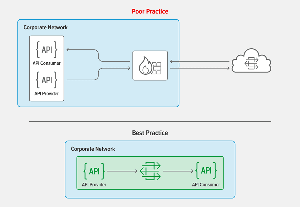 For security reasons, internal API traffic must remain behind the corporate firewall, which precludes routing calls to an external cloud. This is true even for enterprises that host applications and APIs in their own private cloud environments.