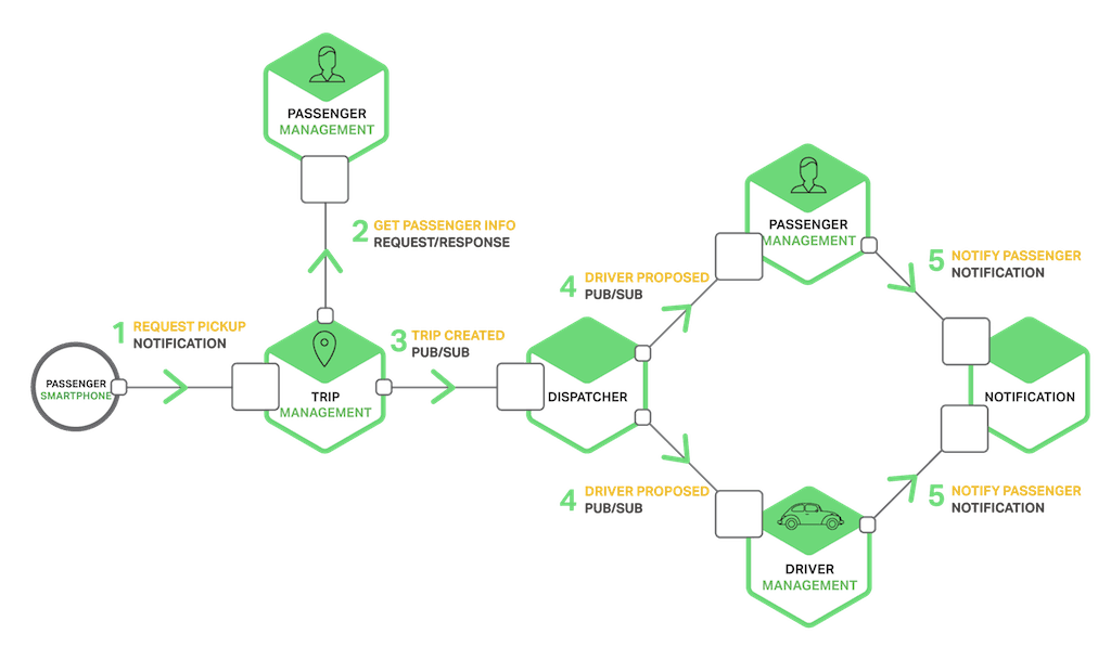 The services use a combination of notifications, request/response, and publish/subscribe. For example, the passenger’s smartphone sends a notification to the Trip Management service to request a pickup. The Trip Management service verifies that the passenger’s account is active by using request/response to invoke the Passenger Service. The Trip Management service then creates the trip and uses publish/subscribe to notify other services including the Dispatcher, which locates an available driver.