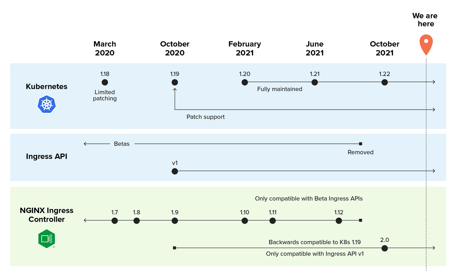 - October (v2.0.3) – Though not a major milestone in terms of capabilities, this release represents a milestone for interoperation with the Kubernetes API and the evolution of the Ingress object. This change means NGINX Ingress Controller 2.0 (and later) is compatible with Kubernetes 1.19 and later. NGINX Ingress Controller 2.0 is also the only version you can deploy with Kubernetes 1.22 and later.