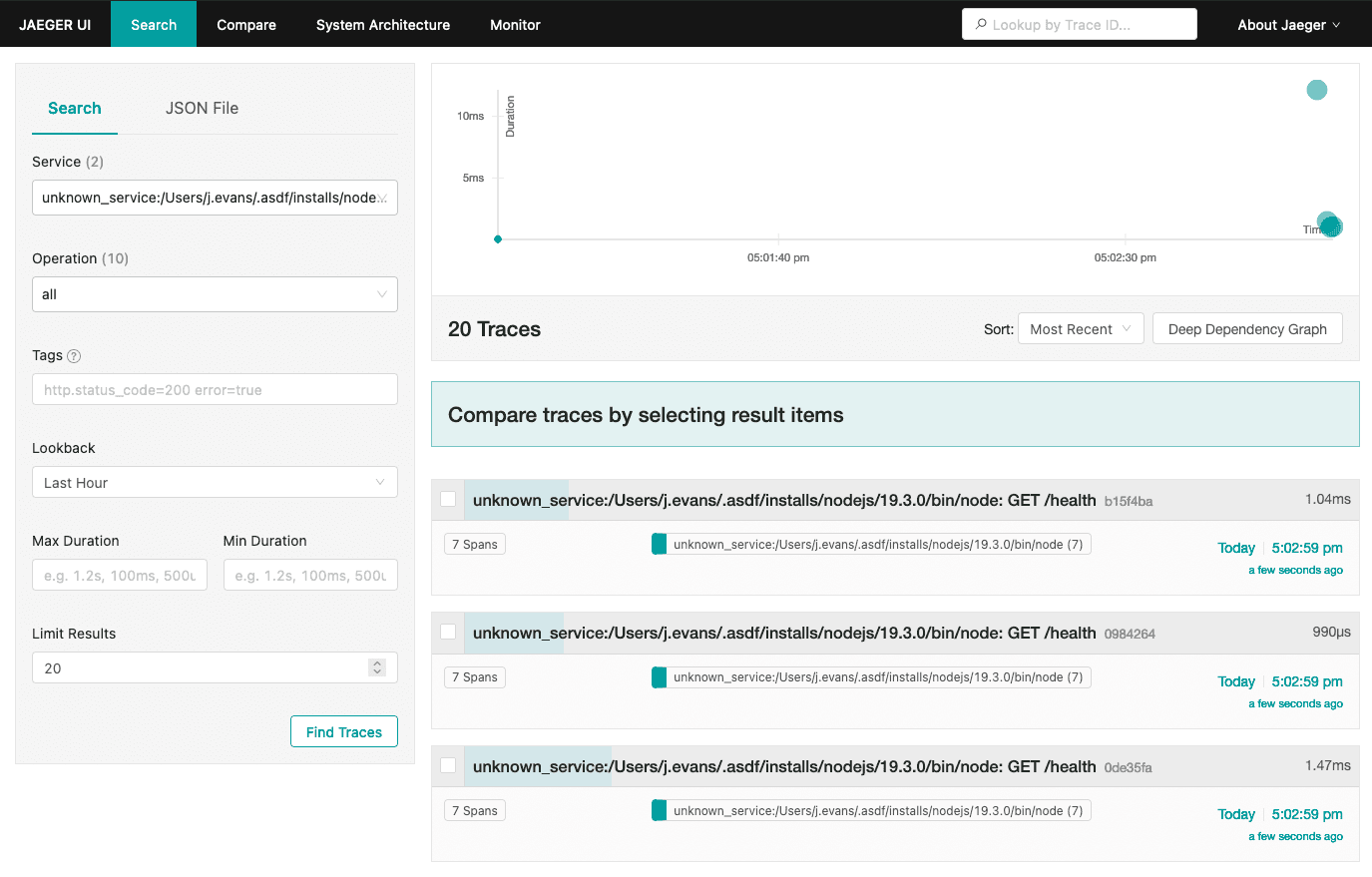 7. The trace IDs match in the console, but as a final step you can compare them to the trace ID in the Jaeger UI. Open the UI at the relevant trace ID endpoint (yours will be different, but in this example it is http://localhost:16686/trace/29377a9b546c50be629c8e64409bbfb5) to see the whole trace. The Jaeger trace confirms that: