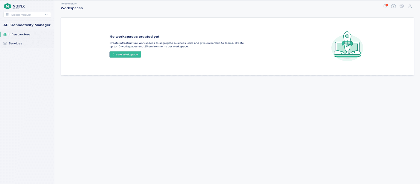 - Click the + Create button to create a new workspace, as shown in Figure 2. Figure 2: Creating a new Infrastructure Workspace