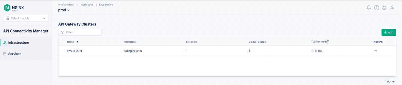 Within an Environment, an API Gateway Cluster is a logical grouping of NGINX Plus instances acting as API gateways. A single Environment can have multiple API Gateway Clusters which share the same hostname (for example, api.nginx.com, as in this tutorial). The NGINX Plus instances in an API Gateway Cluster can be located in more than one type of infrastructure, for example in multiple clouds.