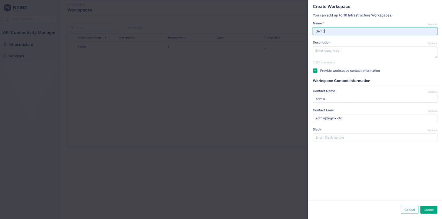 - In the Create Workspace panel that opens, fill in the Name field (demo in Figure 3). Optionally, fill in the Description field and the fields in the Workspace Contact Information section. The infrastructure admin (your Platform Ops team, for example) can use the contact information to provide updates about status or issues to the users of the Workspace. Figure 3: Naming a new Infrastructure Workspace and adding contact information