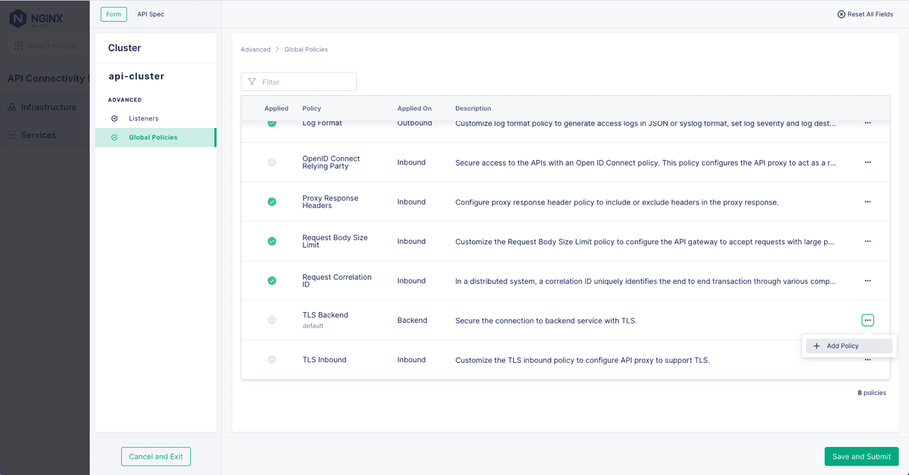 - Click Global Policies in the left navigation column, and then the … icon in the rightmost column of the row for the policy (TLS Backend in Figure 17.) Select + Add Policy from the drop‑down menu. Figure 17: Adding a global policy to an API Gateway Cluster