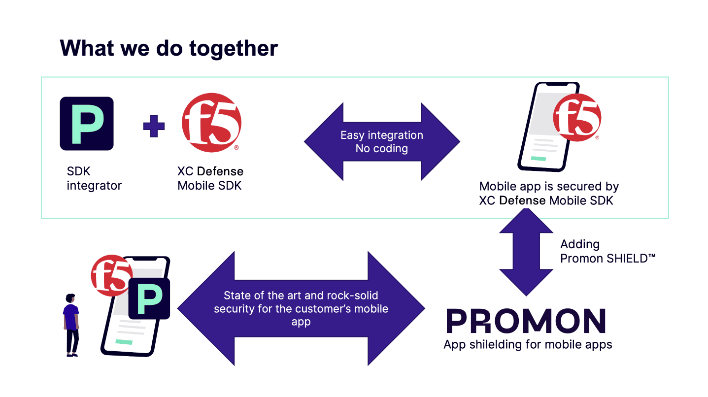 With the F5 and Promon partnership, customers can quickly and easily implement the full functionality of Distributed Cloud Bot Defense for mobile apps through Promon’s no-code, hassle-free SDK integration platform. This means that Android and iOS apps can be quickly secured (within minutes) without touching the app code. Once secured, the app is immediately ready for distribution via public app stores.