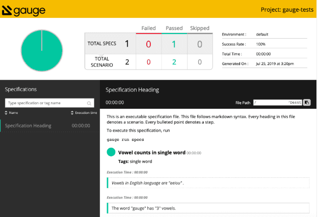 Specifications: Specifications aren’t simply listing the specifications for a feature of a product: They are a way to both organize the test code, and set up the HTML or XML reports. Each element in the *.spec file corresponds to an element in Markdown. Specifications are a “business layer test case which can also act as your feature documentation. They are written in the business language. Typically a spec or specification describes a particular feature of the application under test,” according to the official Gauge documentation.