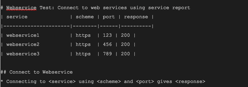 Let’s say that you have a series of webservices that need to be tested, hitting an API endpoint. Given the webservice name, the scheme, and the port, you need to check that the HTTP Response will be 200 OK.