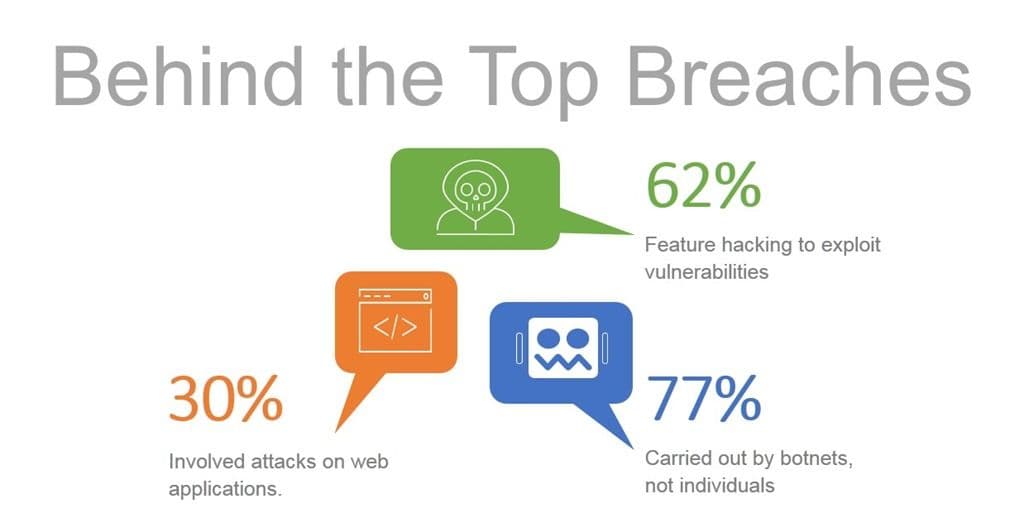 In fact, if we examine the top breaches we find that 30% involved attacks on web applications. A significant 62% featured hacking to exploit a vulnerability. And a staggering 77% were carried out by botnets – not individuals.