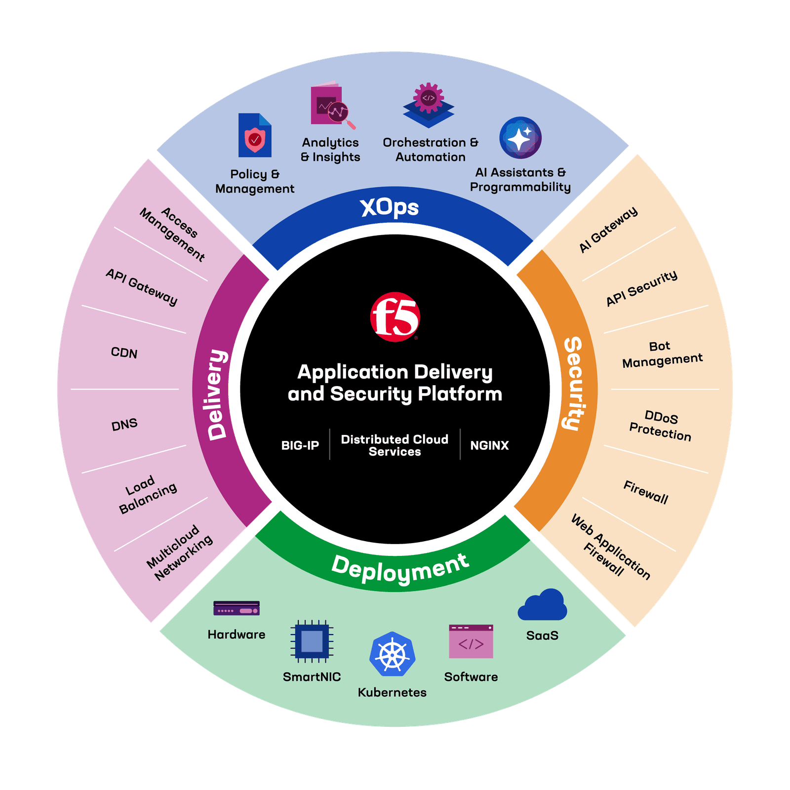 The F5 Application Delivery and Security Platform converges what are currently point solutions to address critical needs such as high-performance load balancing, multicloud networking, full web app and API security, and AI gateway capabilities.