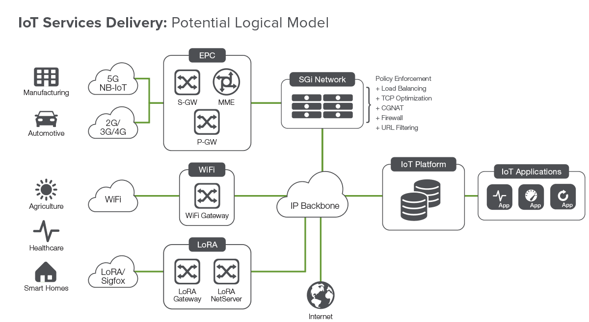 To survive and thrive in the evolving 5G/IoT ecosystem, service providers must deliver connectivity and become "Value Added Services Providers" through partnerships and tight integration of solutions. Below is a potential logical network and services delivery model that service providers could implement in their network—per the network-slicing concept—for each of the industry vertical use cases.